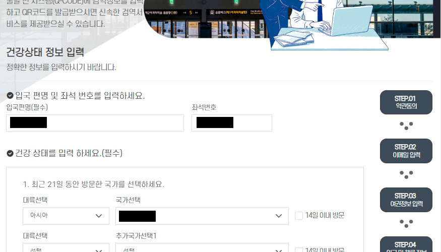 Quarantine information pre-entry system registration is " 01. Agree to Terms of Use > 02. Enter email > 03. Enter passport information > 04. Enter entry and stay information > 05. Enter quarantine information > 06. Enter health status > 07. Check input information > 08.QR code issuance " proceeds in the order, please refer to the capture below for the order.